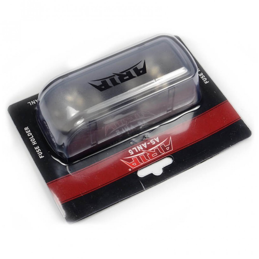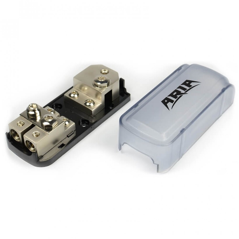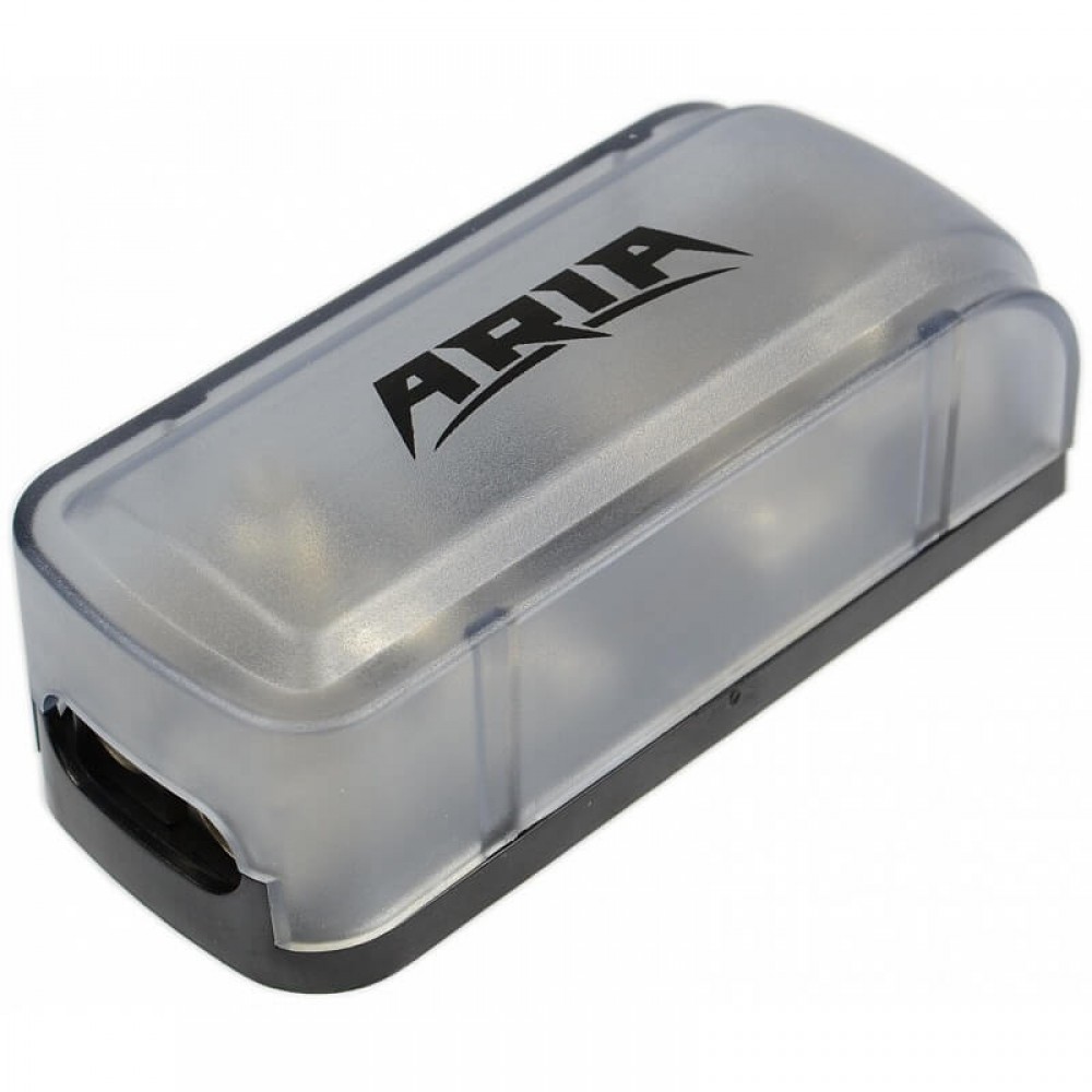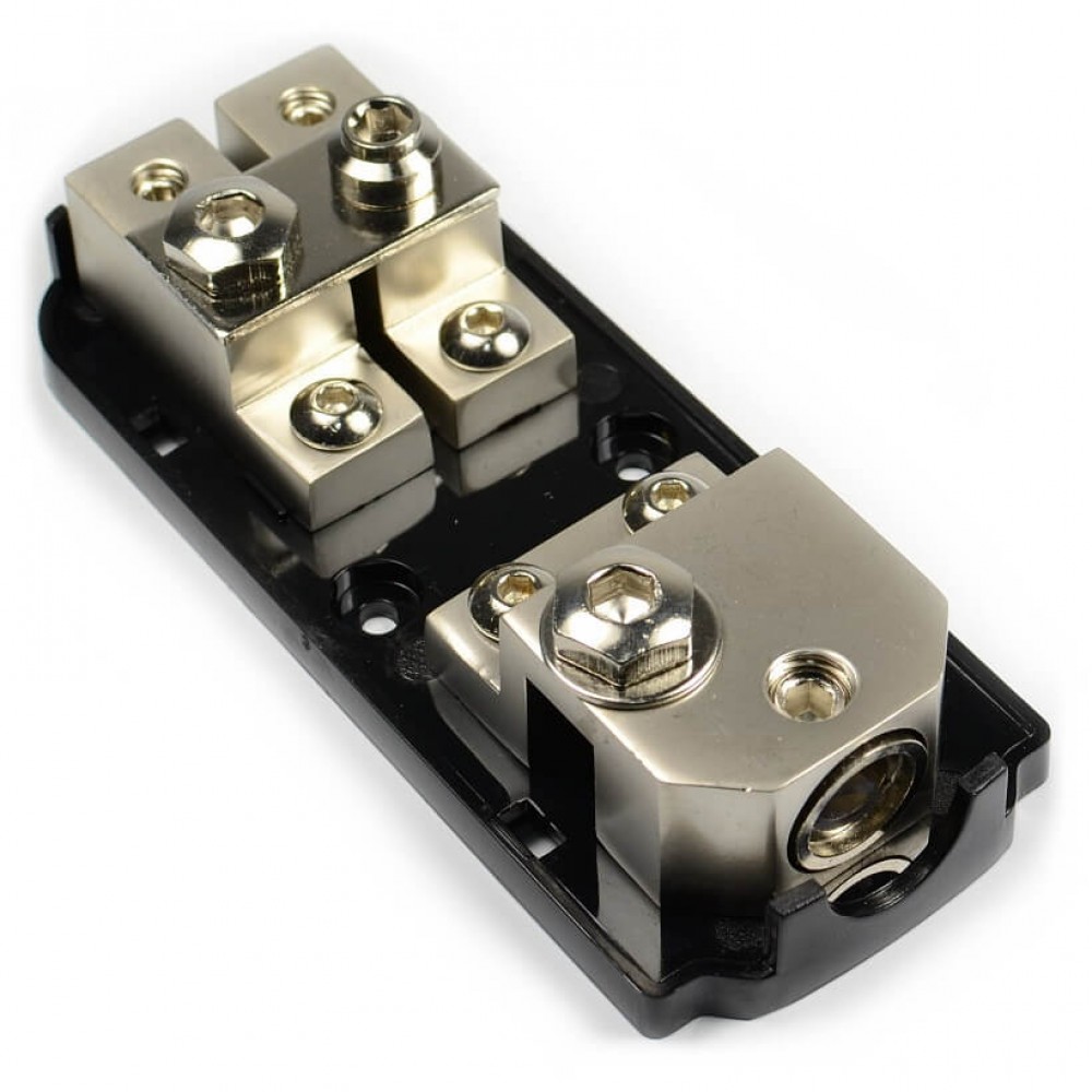 Высокотемпературный ударопрочный пластиковый защитный кожух Никелевое покрытие Вход: 1х1/0Ga (53,5 мм2) или 1х4Ga (21,5 мм2) Выход: 2х4Ga (21,5 мм2) или 2х8Ga (8,35 мм2) Предназначен для установки одного предохранителя ANL, двух предохранителей miniANL