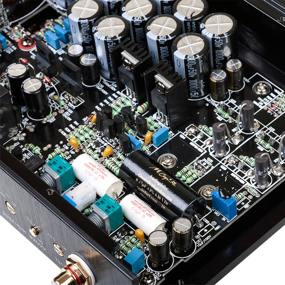 Комплектуется MOSFET в выходном каскаде, электролитическими конденсаторами Rubycon и Nichicon (Япония), пленочными конденсаторами Mundorf Mcup Classic, Mcup ZN Classic, Wima, Siemens (Германия), Hi-End-потенциометр ALPS, ОУ National Semiconductor LME49710 в цепи Gain.