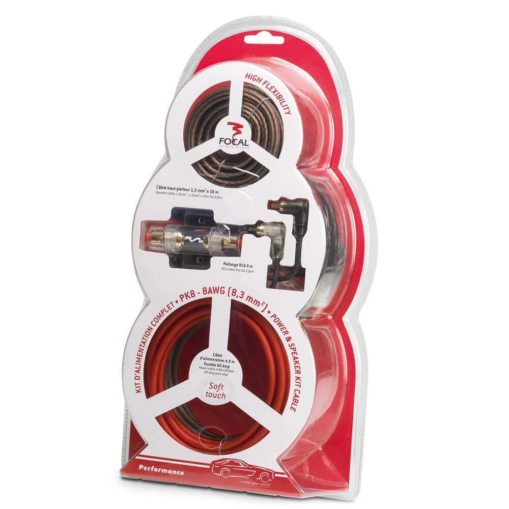 Готовый к использованию комплект электропроводки PK 8 идеально подходит для автомобильных аудиосистем линейки Focal Performance. Он содержит кабель питания с мягким покрытием из ПВХ сечением 8,3 мм2, а также кабель динамика, кабель RCA, держатель предохранителя и аксессуары.
