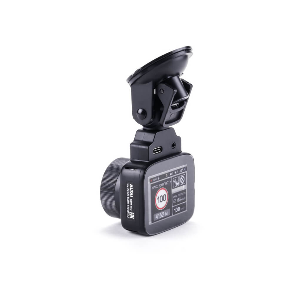 Особое внимание уделено поворотному механизму крепления комбо-устройства. SDR-140 Altai оснащен быстросъемным магнитным креплением к базе, которая в свою очередь крепится на стекло при помощи вакуумной присоски или скотча 3М (дополнительная сменная площадка). База имеет гнездо питания форм-фактора USB-Type C и вход для дополнительной камеры jack 3,5мм. В результате продуманного решения, Вам достаточно снять само устройство, а база крепления остаётся на стекле с подключенным питанием.