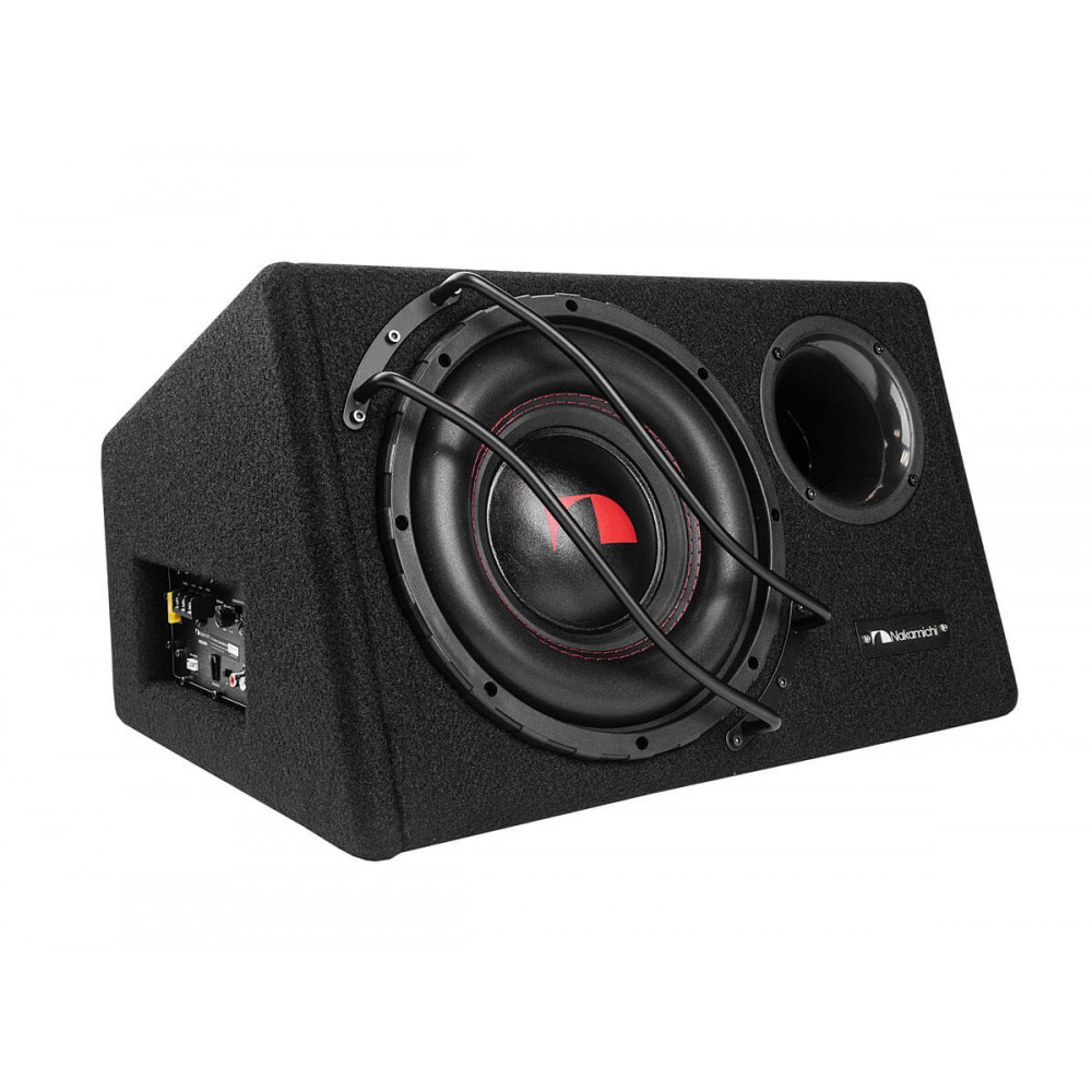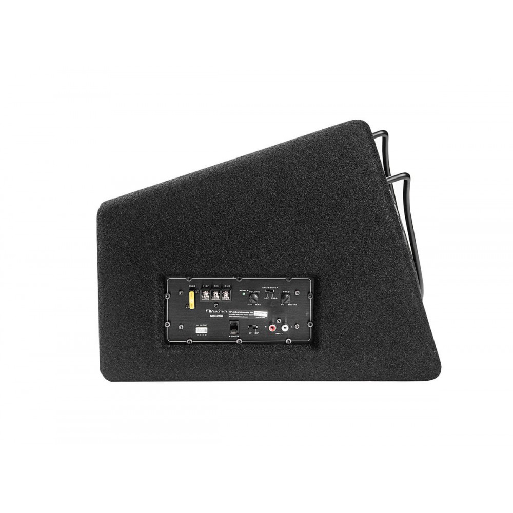 NGB25A - корпус из МДФ, динамик 10", усилитель мощностью 150 Вт, ФНЧ 40 - 200 Гц, Фазовращатель 0 - 180°, фиксированный подтональный фильтр (сабсоник) 20 Гц, входы RCA и высокого уровня. Отделка- черный карпет с фирменным логотипом. Металлический гриль.