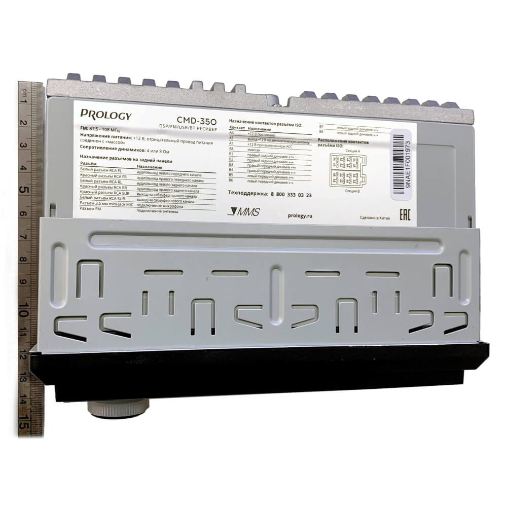PROLOGY CMD-350 — FM / USB ресивер с Bluetooth и встроенным DSP - аудиопроцессором, стандартного размера 1DIN, который обеспечивает прием радиостанций в диапазоне FM / УКВ / AM и воспроизведение медиафайлов MP3, WAV, и FLAC форматов, записанных на USB накопители, передачу звука с внешних источников через линейный аудиовход и беспроводной интерфейс Bluetooth. Поддерживается управление мобильным телефоном через интерфейс Bluetooth (ver. 4,2).