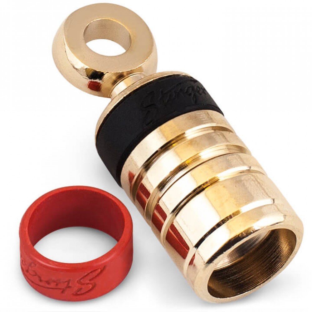 Stinger SPT820 — позолоченная латунная силовая клемма с кольцом диаметром 8 мм под кабель 1/0 Ga — 2 Ga. В комплекте сменные колечки черного и красного цвета. Латунь — эталонный материал для изготовления соединительных элементов используемых в автозвуке, т. к. она обладает достаточной прочностью, чтобы сохранять надежность соединения под воздействием вибраций, при этом у латуни минимальные значения удельного сопротивления, что позволяет предотвратить просадки напряжения и нежелательные искажения звукового сигнала.