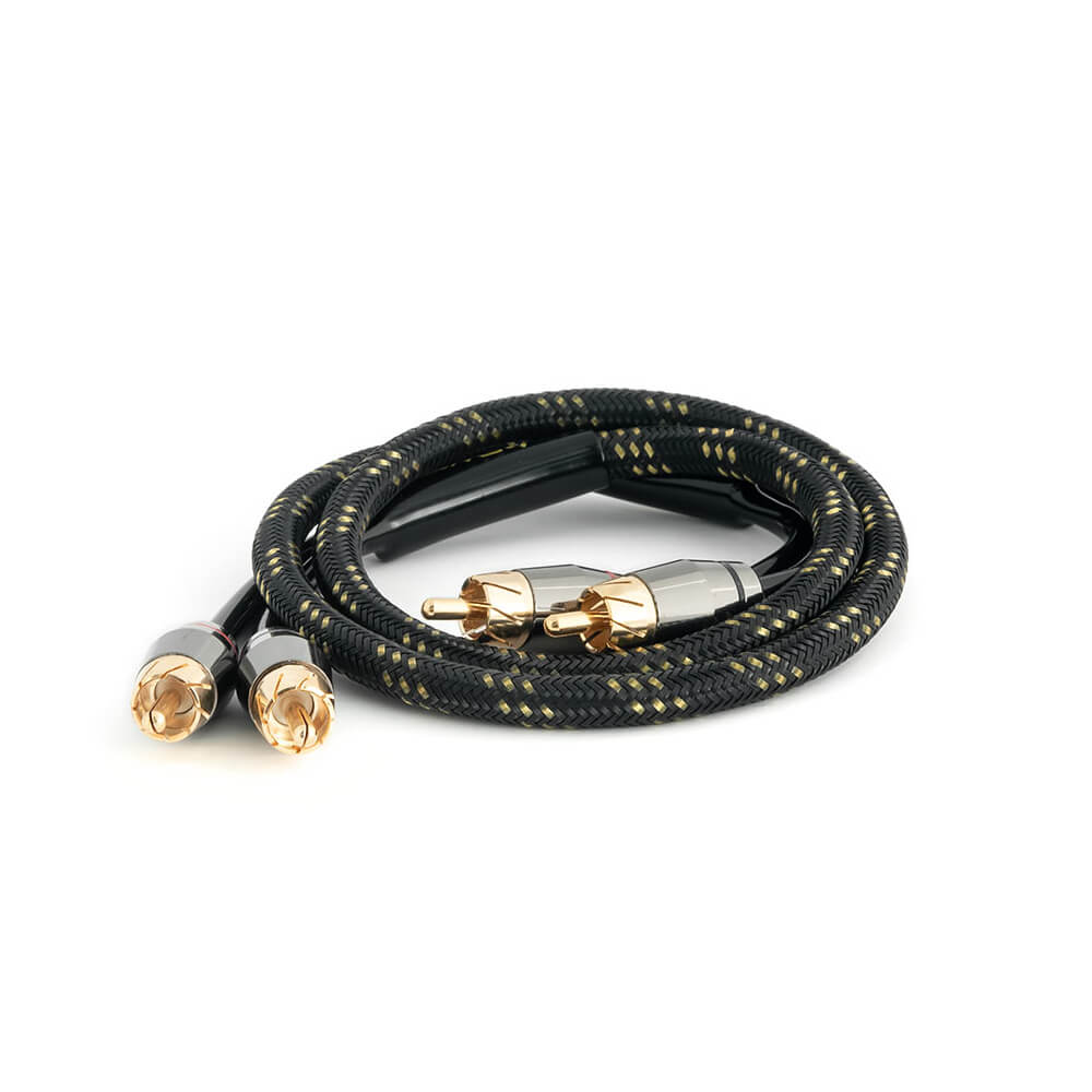 Проводники OFC – бескислородная медь высокой степени очистки. Модифицированный термостабильный ПВХ и плетеная оболочка из полиэстеровых нитей. Тройная защита от помех. Плотное плетение, для повышения степени помехозащищенности. RCA разъемы – позолоченное покрытие, корпуса латунные, компактные, герметичные, с идентификаторами каналов. Центральный контакт и юбка разрезные, для улучшенного контакта. Длина – 35 мм.