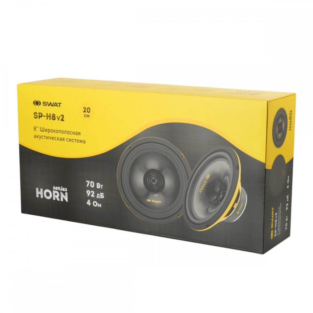 - Дизайн акустики HORN V2 выполнен в запоминающемся и ярком сочетании корпоративных цветов бренда SWAT – черном и энергично желтом. В таком же стиле сделан и обновленный дизайн упаковки, который для моделей 2025 года выпуска получил новый логотип. Упаковка выполнена из прочного картона с матовой ламинацией, это очень важно для надежной транспортировки продукта на дальние расстояния, на региональные склады дилеров и маркетплейсов.