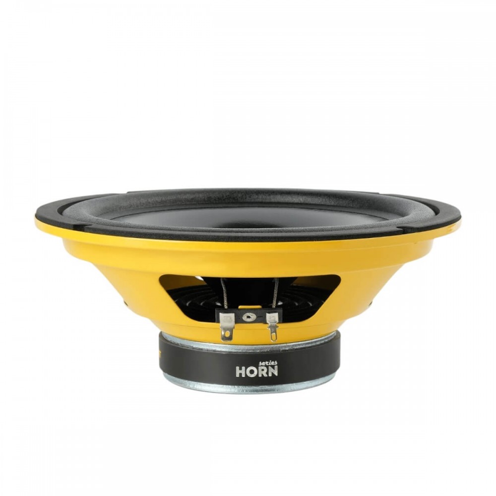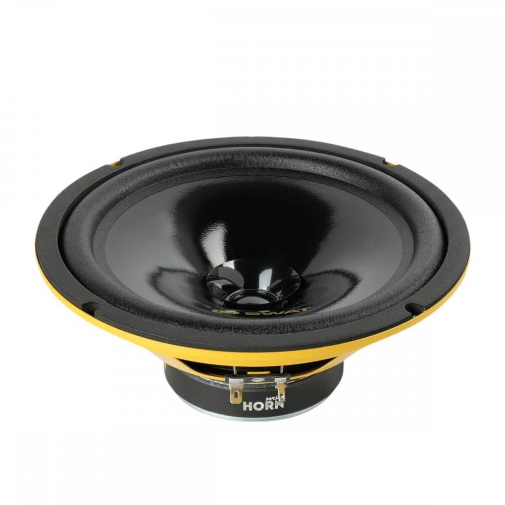 - Серия SWAT HORN V2 получила свое название из-за конструкции центрального колпачка с рупором, который в сочетании с короткозамкнутым витком в магнитной системе (кольцо Фарадея) существенно расширил полосу частот в верхнем регистре при малых искажениях – до 16 кГц! Одним из преимуществ диффузоров из целлюлозы является отсутствие выраженных резонансов, поскольку материал состоящий из отдельных волокон имеет хорошее демпфирование, что обеспечивает натуральную передачу голосового диапазона с богатыми реалистичными тембрами. С другой стороны, большой линейный ход подвижной системы позволяет уверенно отыгрывать низкочастотный диапазон.